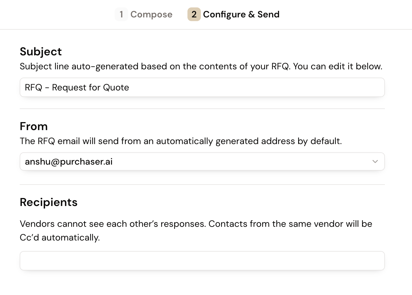 Once your draft is ready, select Next Step to proceed to the Configure & Send step of creating an RFQ. At this step you can finalize your email settings, including the subject line, sender address, and recipient list.
