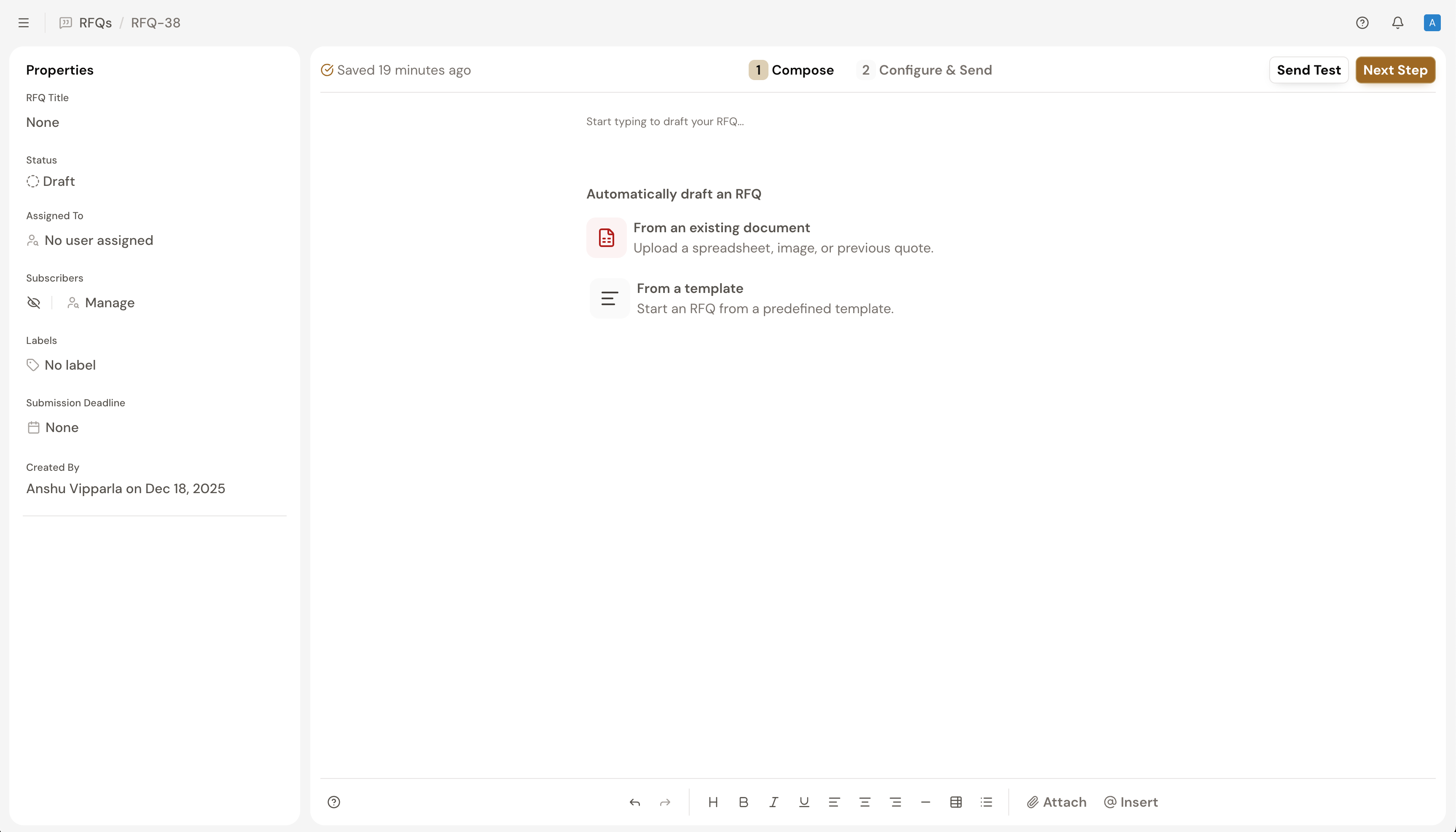 For complex RFQs, you have the option of sending a test email to yourself to verify formatting, attachments, and overall clarity. Select Send Test to deliver a preview to the email you're currently logged in as. While the RFQ editor provides a preview of the email, the test email ensures you see exactly what your vendors will receive to help you make sure your RFQ is ready to send.